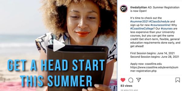This ad played in the Daily Titan's social media platforms to increase summer enrollments for Coastline College targeting the University students before they head home for the summer.